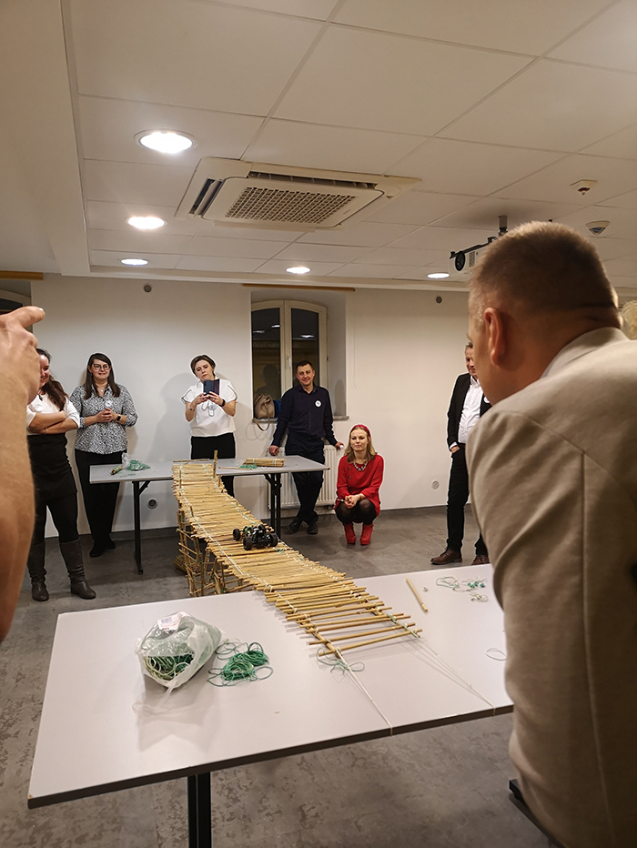 Dwa stoły, 2,5 metra przestrzeni, odrobina materiałów i ograniczony czas. Brzmi znajomo? Zespoły muszą wspólnie zaprojektować i zbudować konstrukcję, która nie tylko się nie rozpadnie, ale… przejedzie po niej nasze firmowe auto!
