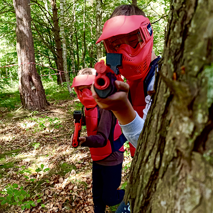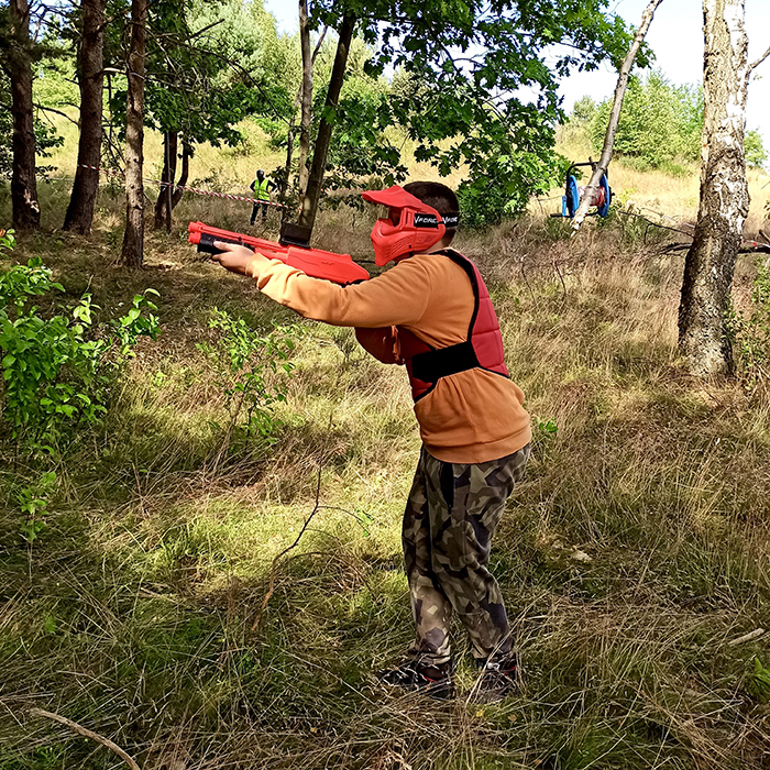 12+ lat: Gramy na leśnych polach, używamy markerów z zasilaniem powietrznym, a dzieci wyposażone są w maski Tippmann Valor oraz ochraniacze. W tym wariancie pojawiają się scenariusze taktyczne – jak ochrona VIP-a, przejęcie flagi czy zespołowy capture the base.